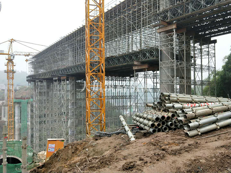 特點(diǎn):現(xiàn)澆梁支架平臺(tái)的跨度大,高度高,使用的貝雷片數(shù)量達(dá)到1808片,加強(qiáng)弦桿2800根,工程于2017年9月開始施工。